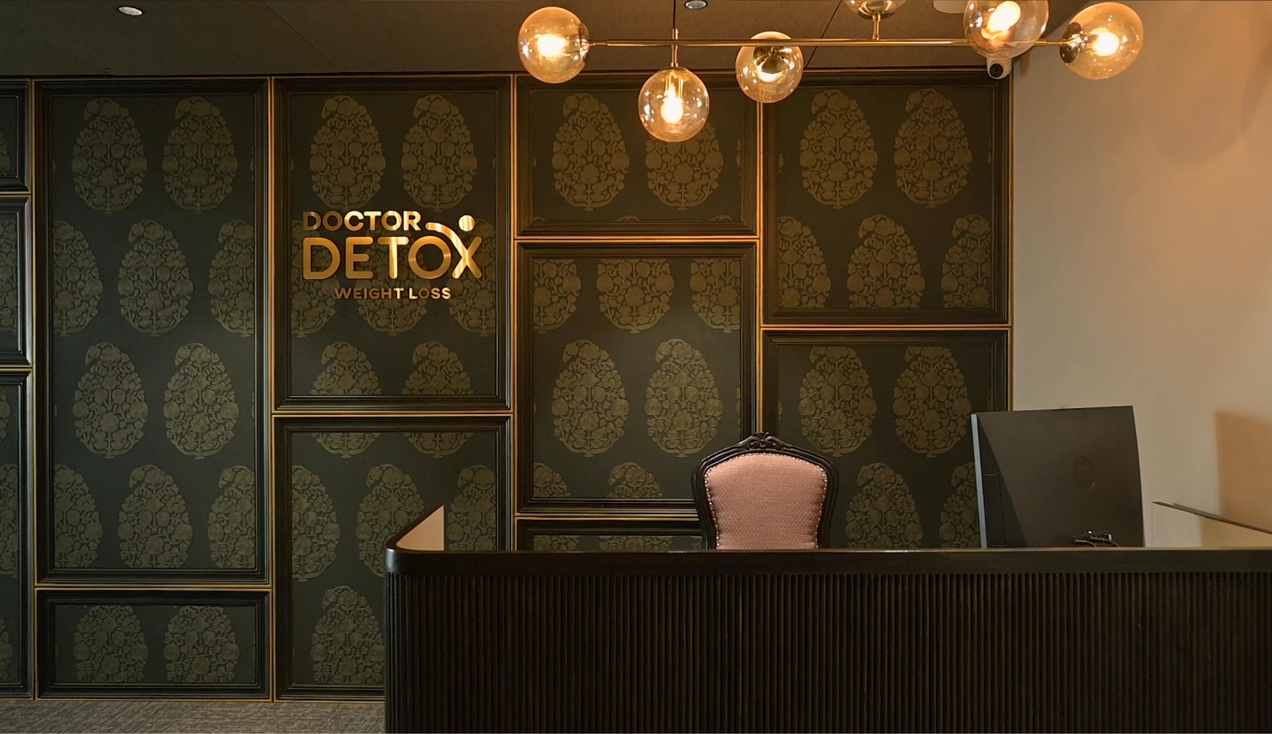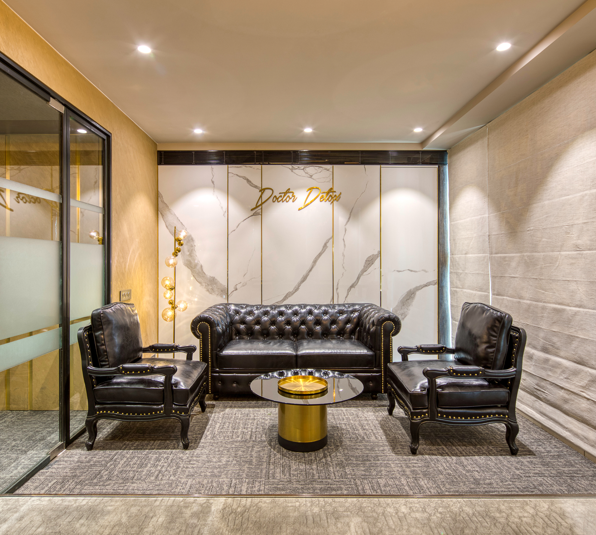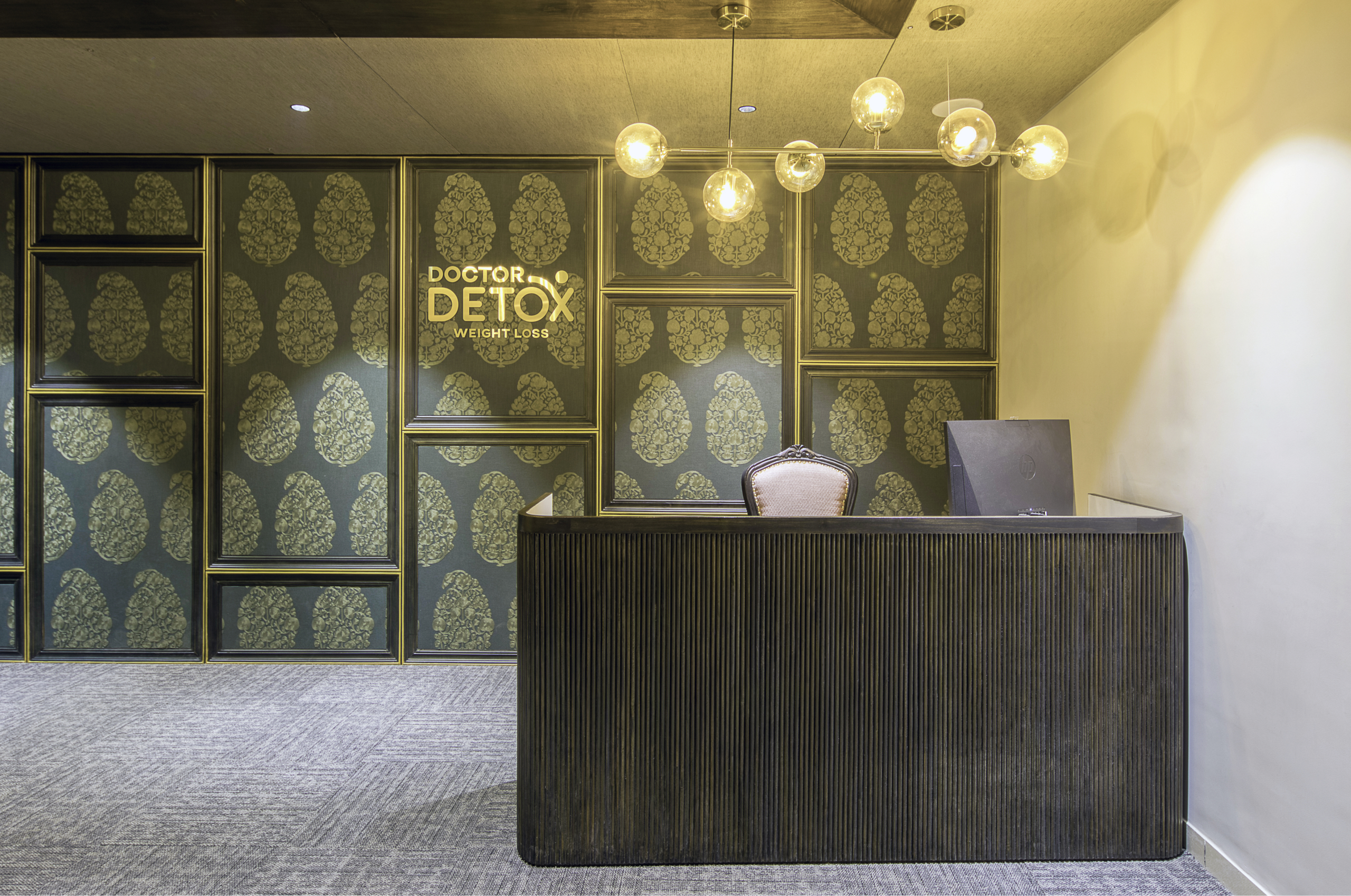 A bespoke luxury office interior merging past grandeur with modern sleekness for Dr. Detox’s elite brand.
