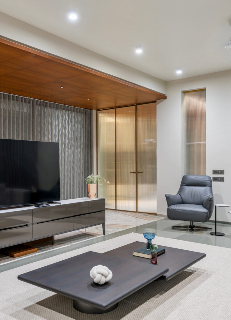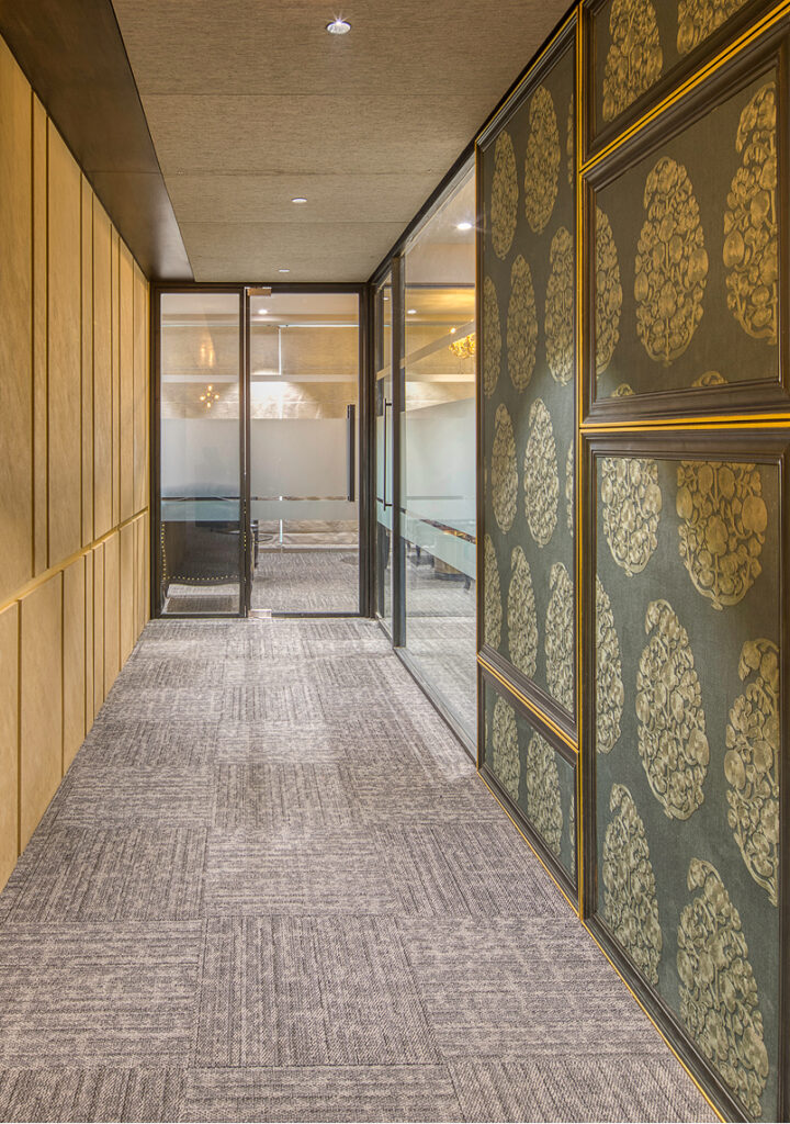 In Vastrapur’s prime location, the Dr. Detox office by Ocean Design Studio embodies Royal Contemporary interior design. This 850 sq. ft. commercial interior project fuses Traditional Fusion heritage with authority via Sabyasachi wallpaper, black-polished wooden borders, and golden highlights for an artistic, imposing backdrop.