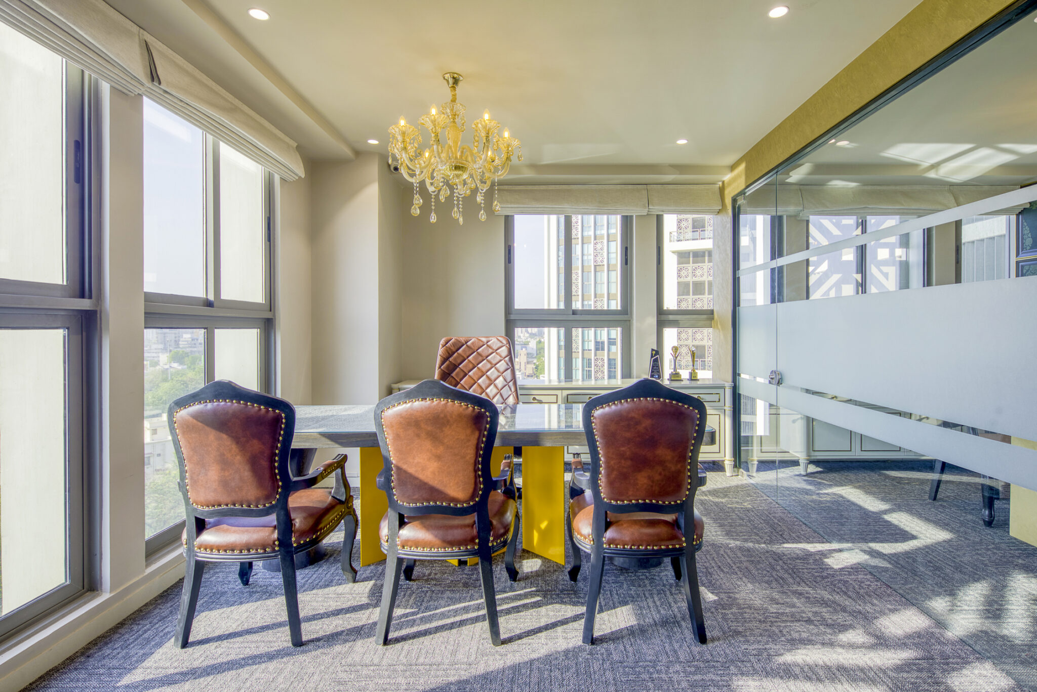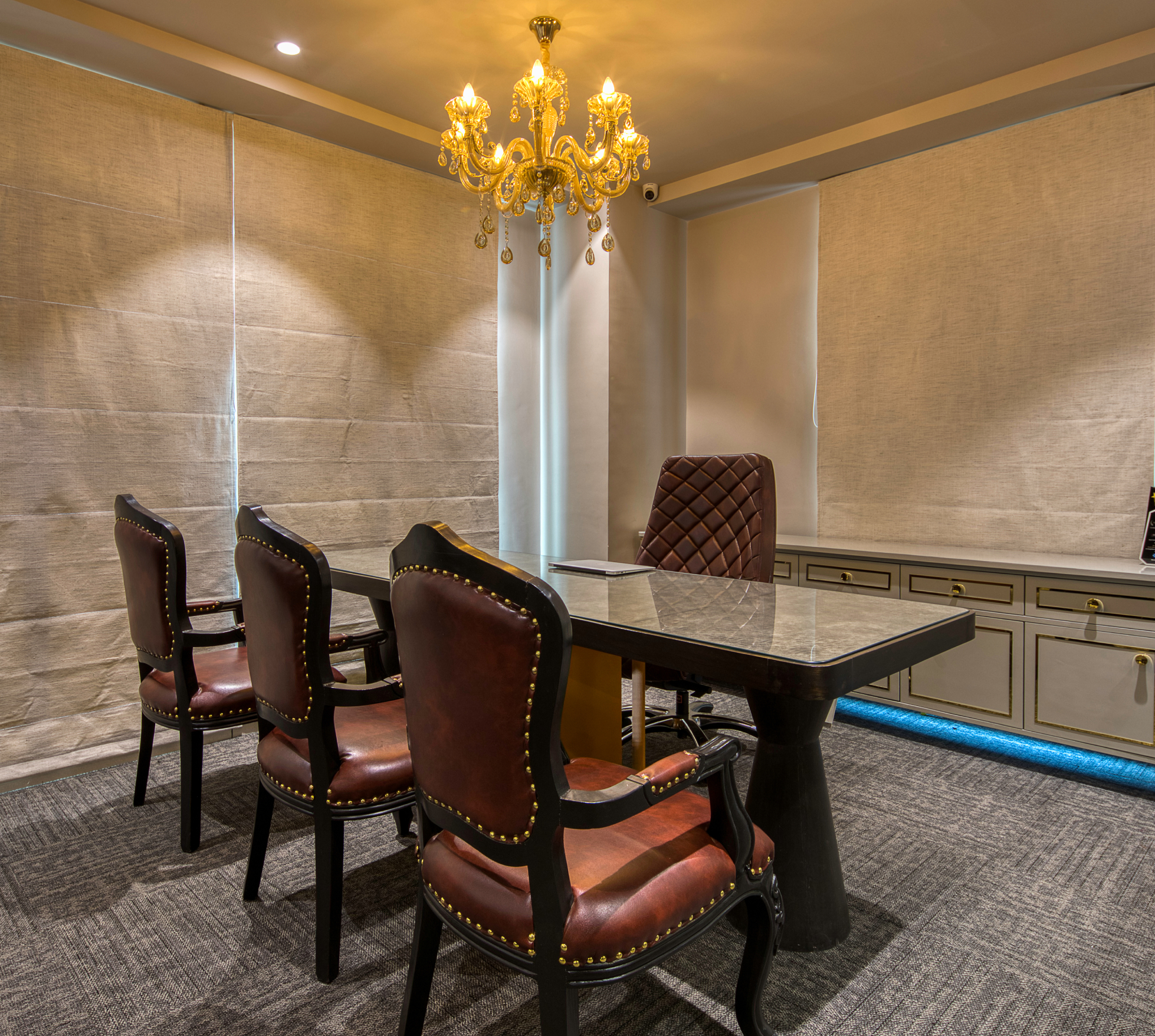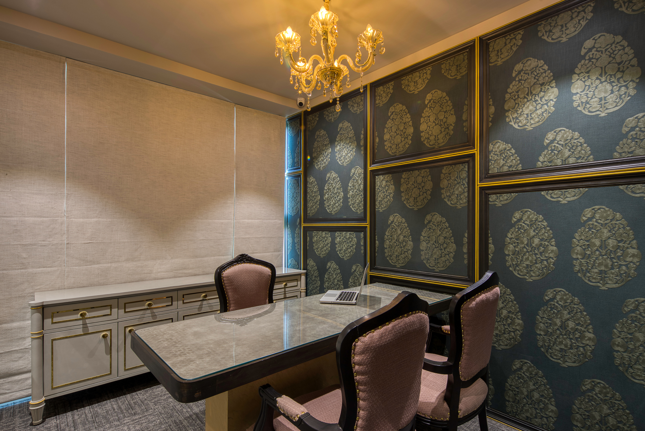 • Royal Workspace: Centrepiece main table with traditional royal theme; cabin tabletop blends fabric and glass for contemporary texture.