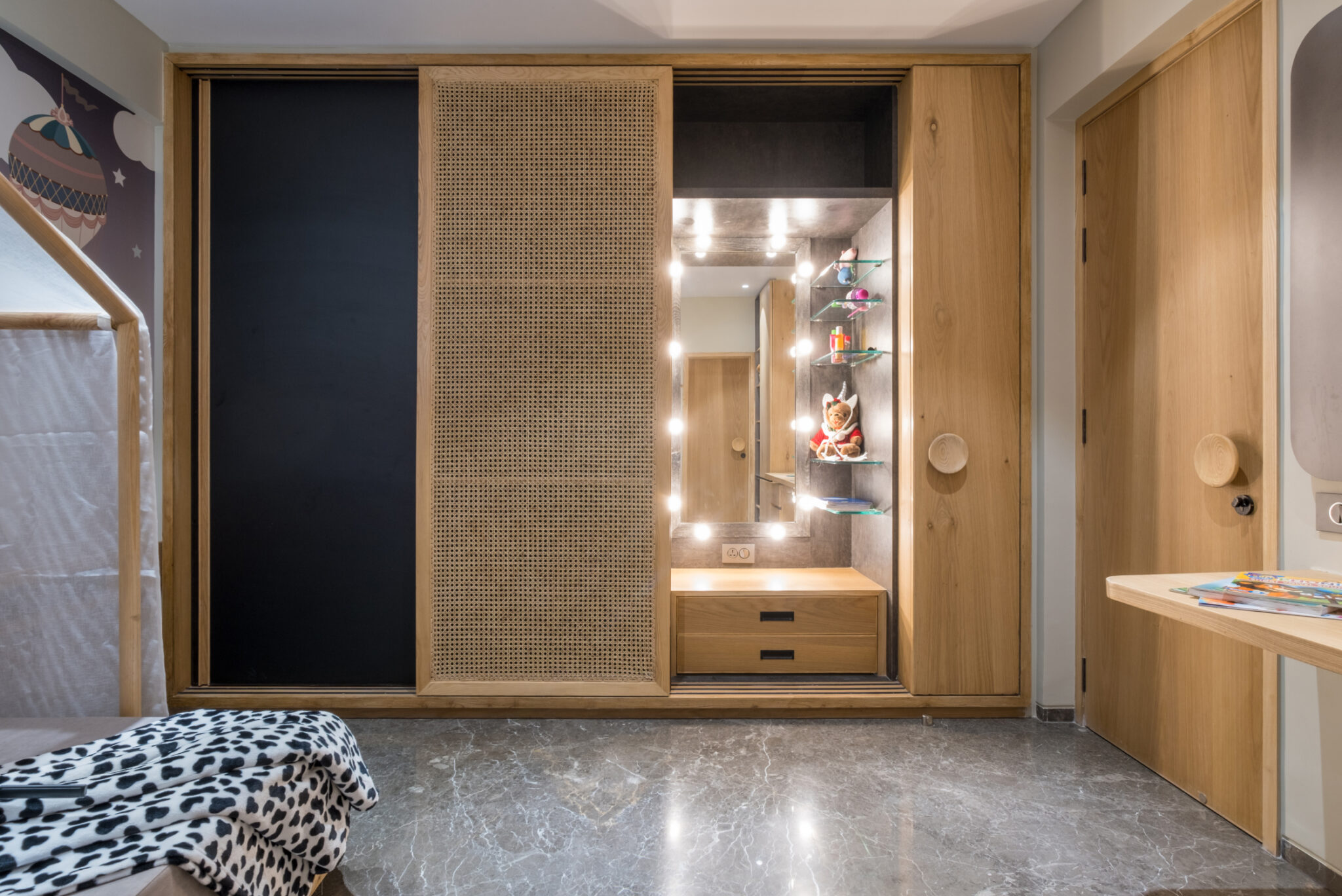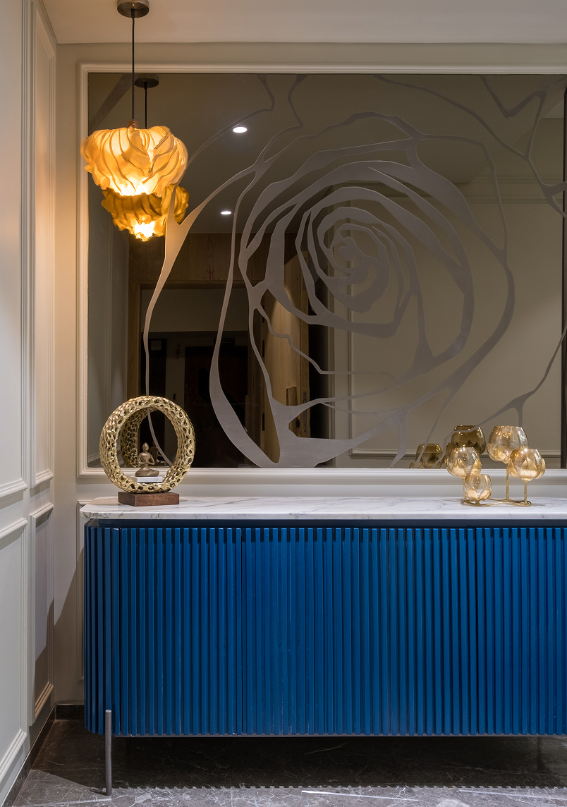 • Master Bedroom: Luxurious haven with striking bronze round mirror, sophisticated fabric paneling with edge molding, and custom sliding wardrobe featuring tinted gray glass & delicate wooden patti details.