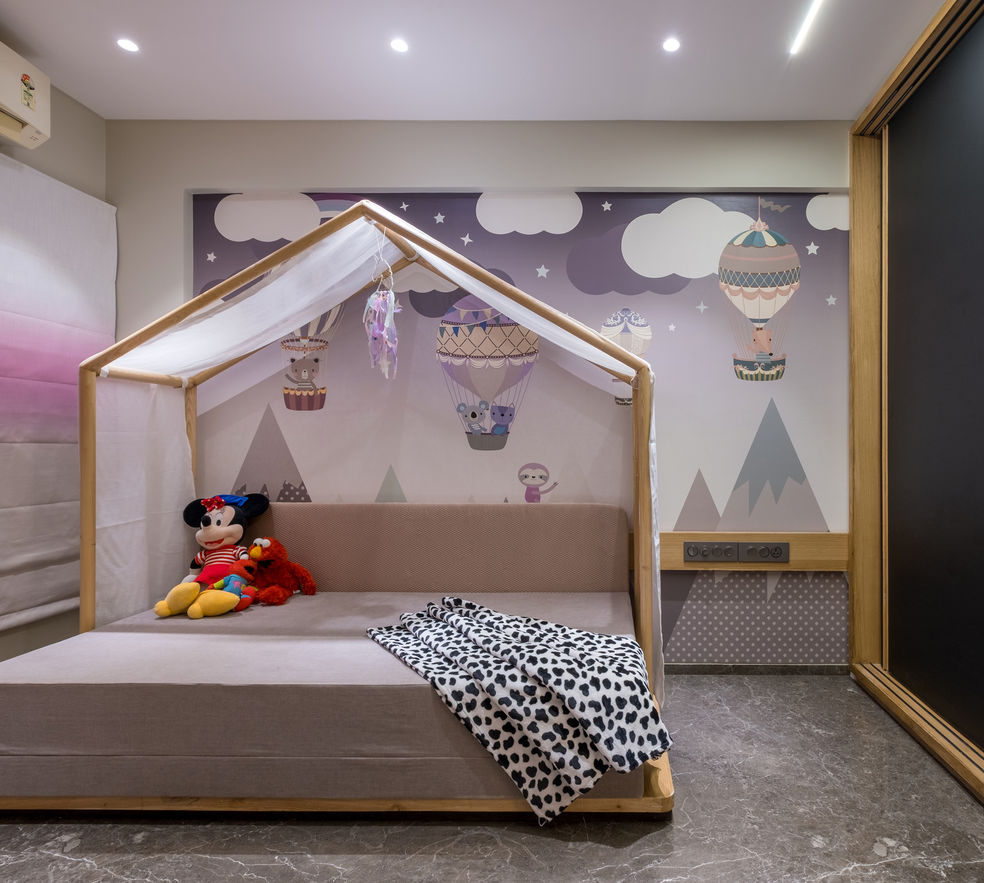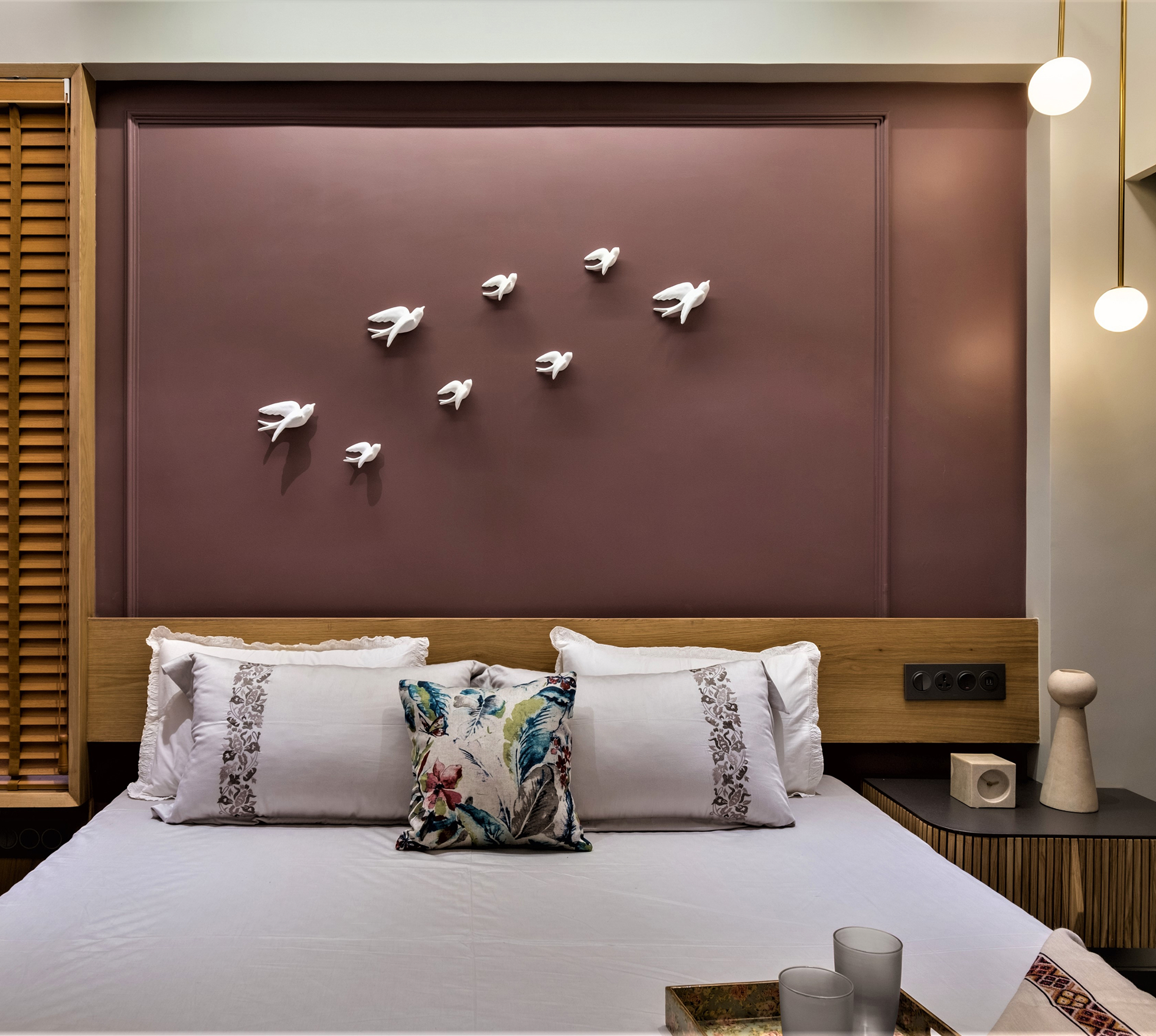 • Guest Room: Serene retreat boasting unique fabric-slider wardrobe, rich veneer drawers, wooden blinds, and artistic pigeon wall sculptures for meditative peace.